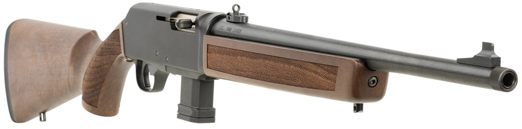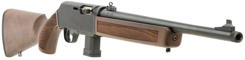 Henry Homesteader 9mm featuring fixed American Walnut stock; 2-piece pistol grip; rubber buttplate; top mounted thumb switch; ambidextrous bolt handle; threaded, drilled and tapped steel barrel; accepts Weaver 63B scope mount. Includes swivel studs and 5rd and 10rd Henry magazines.
