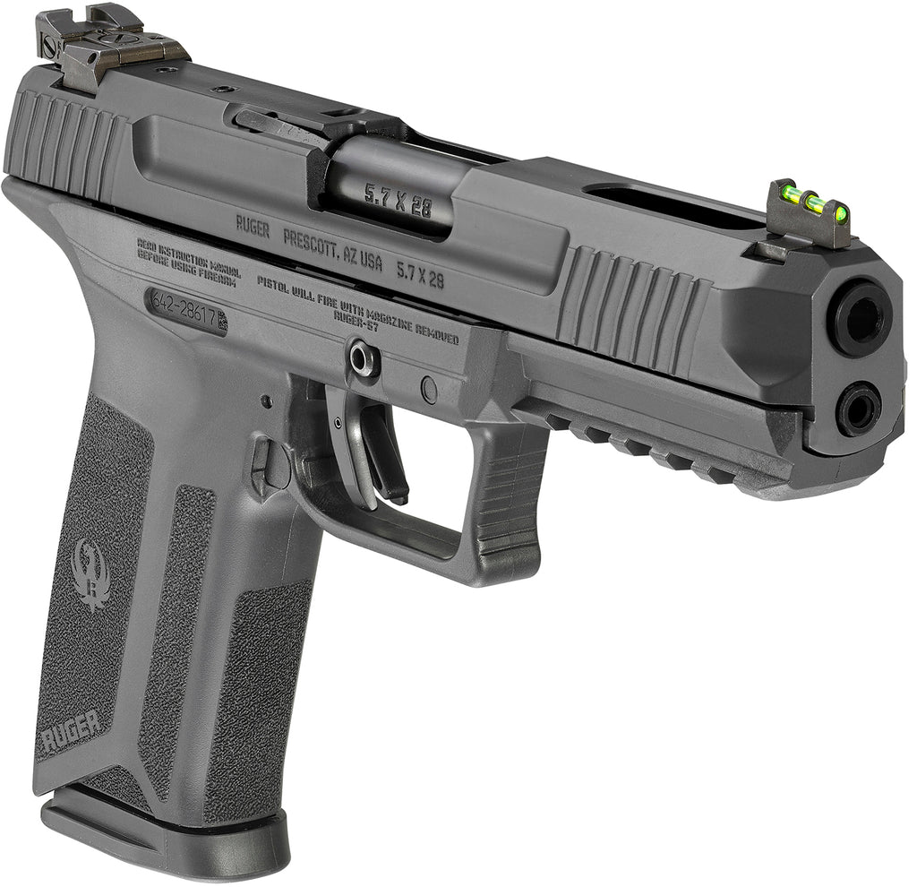 The Ruger-57 features impressive ergonomics which include an easy trigger reach, robust slide release and reversible magazine release latch. Through hardened, billet steel slide with lightening cuts is drilled and tapped for easy mounting of optics. The alloy steel barrel features a black nitride treatment for wear resistance, while the textured, ergonomic frame provides a secure and comfortable grip. It utilizes Ruger's safe, reliable and proven Secure Action fire-control system that combines a protected internal hammer with a bladed-safety trigger. The trigger has a short, smooth pull, clean break and positive reset. Safety features include: Integrated trigger safety; light-weight Gring pin; neutrally balanced sear with signiGcant engagement and strong spring tension; and hammer catch to help prevent the hammer from contacting the Gring pin unless the trigger is pulled The Ruger-57 also features inspection port and Picatinny-style accessory rail for easy mounting of lights and lasers.